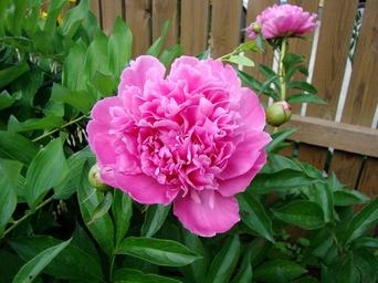Keywords: flower peony bloom beautiful garden fence summer pink green