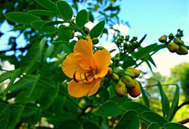 Keywords: flower shrub pistil stamen foliage yellow flower exotic