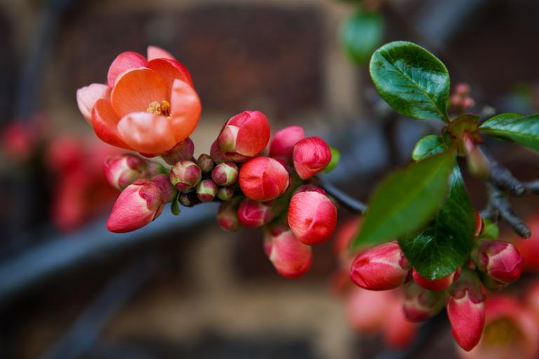 Keywords: flowering quince chaenomeles red pink green bright colourful bloom