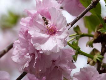 Keywords: flowering tree bee pink spring bloom insects flying insect petals macro garden collects nectar flowers