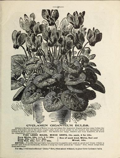 Keywords: Flowers (16263168320).jpg CYCLAMEN GIGANTEUM BULBS <br> Always a favorite pot plant of flower lovers and since the improved Gigantpum has come before the <br> public it is really one ot the most sought after high priced plants in the market tine specimens often <br> selling for 1 25 a pot with a single bulb The flowers are large durable and very beautiful as is also <br> the beautifully zoned leaves <br> FINE LARGE BULBS MIXED SORTS 15c each 2 for 25c <br> iiX „¢o£ e ea h° C 3 fo O f ' °°' j ° e ° f ° ach kind ' White ' Red a d <br> Deep Red 20c each 3 for 50c – Â» Mixed 45c <br> NOTICE ” You will find my bulbs very superior in quality and quick to grow and bloom which is <br> not the case with all buibesold because I keep my bulbs packed in ¢Â« Jadoo fibre which keeps them <br> fresh and active <br> For 10c I will send sufficient Jadoo fibre when mixed with soil to plant three Cyclamen bulba 43800644 148987 77812 Text http //www biodiversitylibrary org/page/43800644 1900 Henry G Gilbert Nursery and Seed Trade Catalog Collection ; Miss Mary E Martin Firm ; Miss Mary E Martin Firm NameFound Cyclamen giganteum NameFound Gigantpum Biodiversity Heritage Library Flowers Christmas Easter midwinter and spring Garden Stories Catalogs Flowers Miss Mary E Martin Firm Nurseries Horticulture Seeds U S Department of Agriculture National Agricultural Library bhl page 43800644 dc identifier http //biodiversitylibrary org/page/43800644 bhlGardenStories Cyclamen giganteum BHLinbloom miss mary e martin firm nurseries horticulture u s department of agriculture national agricultural library bhlgardenstories bhlinbloom Information field Flickr posted date ISOdate 2015-02-05 CC-BY-2 0 BioDivLibrary https //flickr com/photos/61021753 N02/16263168320 2015-08-25 00 55 11 cc-by-2 0 PD-old-70-1923 Miss Mary E Martin Firm seed catalog Photos uploaded from Flickr by Fæ using a script