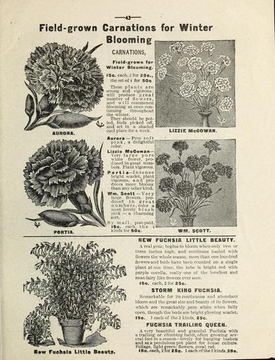 Keywords: Flowers (16448849351).jpg Field-grown Carnations for Winter <br> Blooming <br> CARNATIONS <br> PORTIA <br> Field-grown for <br> Winter Blooming <br> 15c each 2 for 2 So <br> the set of 4 for 50c <br> These plants are <br> strong and vigorous ; <br> will produce great <br> number of flowers <br> and will commence <br> blooming at once con- <br> tinuing throughout <br> the winter <br> They should be pot- <br> ted buds picked off <br> and set in a shaded <br> cool place for a week <br> Aurora Pure soft <br> pink a delightful <br> color <br> Lizzie McGowan <br> Very large pure <br> white flower pro- <br> duced in great mim- <br> bers Plant vigorous <br> Po rt i a Intense <br> bright scarlet plant <br> vigorous and pro- <br> duces more blooms <br> than any other kind <br> Wm Seott Very <br> large flowers pro- <br> duced in great <br> numbers color a <br> most lovely blush <br> pink a charming <br> sort <br> By mail post-paid <br> 15c each the 4 <br> kinds for 50c <br> wm SCOTT <br> e«w Fuehsla Little Bsautf <br> SEW FUCHSIA LITTLE BEAUTY <br> A real gem; begins to bloom when only two or <br> three inches high and continues loaded with <br> flowers the whole season more than one hundred <br> flowers and buds have been counted on a single <br> plant at one time; the tube is bright red with <br> purple corolla really one of the loveliest and <br> most fairy like flowers ever seen <br> 15c each 2 for 25c <br> STORM KING FUCHSIA <br> Remarkable for its continuous and abundant <br> bloom and the great size and beauty of its flowers <br> which are remarkably pure white when fully <br> open though the buds are bright glowing scarlet <br> 15c 1 each of the 2 kinds 25c <br> FUCHSIA TRAILING QUEEN <br> A very beautiful and graceful Fuchsia with <br> a trailing or climbing habit often growing sev- <br> eral feet in a season lovely for hanging baskets <br> and as a pendulous pot plant for house culture <br> Foliage light green; flowers coral red <br> l5e each 2for25e leachofthe3kinds 3Se 43800650 148987 77812 Text http //www biodiversitylibrary org/page/43800650 1900 Henry G Gilbert Nursery and Seed Trade Catalog Collection ; Miss Mary E Martin Firm ; Miss Mary E Martin Firm Biodiversity Heritage Library Flowers Christmas Easter midwinter and spring Garden Stories Catalogs Flowers Miss Mary E Martin Firm Nurseries Horticulture Seeds U S Department of Agriculture National Agricultural Library bhl page 43800650 dc identifier http //biodiversitylibrary org/page/43800650 bhlGardenStories Carnations Aurora Portia Fuschia Wm Scott BHLinbloom miss mary e martin firm nurseries horticulture u s department of agriculture national agricultural library bhlgardenstories wm scott bhlinbloom Information field Flickr posted date ISOdate 2015-02-05 CC-BY-2 0 BioDivLibrary https //flickr com/photos/61021753 N02/16448849351 2015-08-25 00 53 41 cc-by-2 0 PD-old-70-1923 Miss Mary E Martin Firm seed catalog Photos uploaded from Flickr by Fæ using a script |