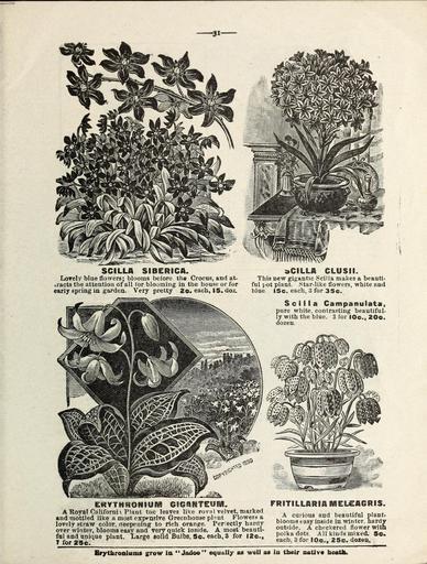 Keywords: Flowers (16449626542).jpg SCILLA SIBERICA <br> Lorely blue flowers; blooms before th« Crocus and at- <br> tracts the attention of all for blooming in the house or for <br> early spring in garden Very pretty 2o each 15 doz <br> CILLA CLUSII <br> This new gigantic Scilla makes a beauti- <br> ful pot plant Star-like flowers white and <br> blue 15c each 3 for 35c <br> Scilla Campanulata <br> pure white contrasting beautiful <br> ly with the blue 3 for IOc 20c <br> dozen <br> ERVTHRONIUM GiGQNTEUfM <br> A Royal Californii Plant tnc leaves like royal velvet marked <br> and mottled like a most expensive Greenhouse plnnt Flowers a <br> lovely straw color deepening to rich orange Perfectly hardy <br> over winter blooms easy and very quick inside A most beauti <br> ful and unique plant Large solid Bulbs 5c each 3 for 12c <br> 7 for 25c <br> FRITILLARIA MELEAGRIS <br> A curious and beautiful plant <br> blooms easy inside in winter nardy <br> outside A checkered flower with <br> polka dots All kinds mixed 5c <br> each 3 for IOc 25c dozen <br> Brythroniums grow la ¢ ¢ Jadoo equally a well as In their native heath 43800638 148987 77812 Text http //www biodiversitylibrary org/page/43800638 1900 Henry G Gilbert Nursery and Seed Trade Catalog Collection ; Miss Mary E Martin Firm ; Miss Mary E Martin Firm NameFound Campanulata NameFound Cilla clusii NameConfirmed Achillea clusii Saut EOLID 6172914 NameFound Fritillaria meleagris NameConfirmed Fritillaria meleagris EOLID 1088535 NameBankID 1672370 NameFound Scilla NameConfirmed Scilla L EOLID 33607 NameFound Scilla siberica NameConfirmed Scilla siberica EOLID 1082428 NameBankID 2669234 Biodiversity Heritage Library Flowers Christmas Easter midwinter and spring Garden Stories Catalogs Flowers Miss Mary E Martin Firm Nurseries Horticulture Seeds U S Department of Agriculture National Agricultural Library bhl page 43800638 dc identifier http //biodiversitylibrary org/page/43800638 bhlGardenStories Scilla bulbs Scilla siberica Fritillaria meleagris Scilla clusii BHLinbloom miss mary e martin firm nurseries horticulture u s department of agriculture national agricultural library bhlgardenstories bhlinbloom Information field Flickr posted date ISOdate 2015-02-05 CC-BY-2 0 BioDivLibrary https //flickr com/photos/61021753 N02/16449626542 2015-08-25 00 50 53 cc-by-2 0 PD-old-70-1923 Miss Mary E Martin Firm seed catalog Photos uploaded from Flickr by Fæ using a script |