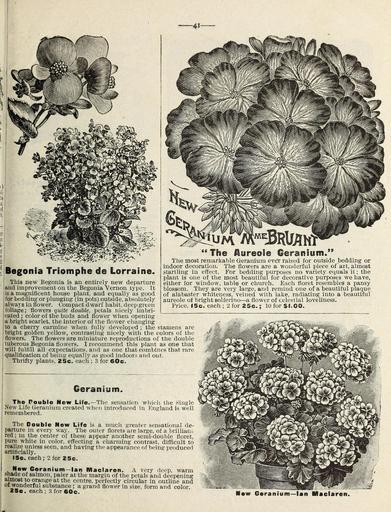 | Keywords: Flowers (16449650122).jpg Begonia Triomphe de Lorraine <br> This new Begonia is an entirely new departure <br> and improvement on the Begonia Vernon type It <br> is a magnificent house plant and equally as good <br> for bedding or plunging in pots outside absolutely <br> always in flower Compact dwarf habit deep green <br> foliage; flowers quite double petals nicely imbri- <br> cated ; color of the buds and flower when opening <br> a bright scarlet the interior of the flower changing <br> to a cherry carmine when fully developed ; the stamens are <br> bright golden yelknv contrasting nicely with the colors of the <br> flowers The flowers are miniature reproductions of the double <br> tuberous Begonia flowers I recommend this plant as one that <br> will fulfill all expectations and as one that combines that rare <br> qualification of being equallv as good indoors and out <br> Thrifty plants 25c each ; 3 for 60c <br> The most remarkable Geranium ever raised for outside bedding or <br> indoor decoration The flowers are a wonderful piece of art almost <br> startling in effect For bedding purposes no variety equals it ; the <br> plant is one of the most beautiful for decorative purposes we have <br> either for window table or church Each floret resembles a pansy <br> blossom They are very large and remind one of a beautiful plaque <br> of alabaster whiteness veined with lake radiating into a beautiful <br> aureole of bright solferino a flower of celestial loveliness <br> Price 15c each ; 2 for 25c ; 10 for 1 00 <br> Geranium <br> The double New Life The sensation which the Single <br> New Life Geranium created when introduced in England is well <br> remembered <br> The Double Hew Life is a much greater sensational de- <br> parture in every way The outer florets are large of a brilliant <br> red ; in the center of these appear another semi-double floret <br> pure white in color effecting a charming contrast difficult to <br> realize unless seen and having the appearance of being produced <br> artificially <br> 15c each; 2 for 25c <br> New Geranium lan Maclaren A very deep warm <br> snade of salmon paler at the margin of the petals and deepening <br> almost to orange at the centre perfectly circular in outline and <br> ol wonderful substance ; a grand flower in size form and color <br> 25o each; 3 for 60c <br> New Geranium lan Maclaren 43800648 148987 77812 Text http //www biodiversitylibrary org/page/43800648 1900 Henry G Gilbert Nursery and Seed Trade Catalog Collection ; Miss Mary E Martin Firm ; Miss Mary E Martin Firm NameFound Begonia NameConfirmed Begonia aff palmata GBG 002-089-95 EOLID 11904651 Biodiversity Heritage Library Flowers Christmas Easter midwinter and spring Garden Stories Catalogs Flowers Miss Mary E Martin Firm Nurseries Horticulture Seeds U S Department of Agriculture National Agricultural Library bhl page 43800648 dc identifier http //biodiversitylibrary org/page/43800648 bhlGardenStories Begonia Aureole Geranium Ian Maclaren BHLinbloom miss mary e martin firm nurseries horticulture u s department of agriculture national agricultural library bhlgardenstories aureole geranium ian maclaren bhlinbloom Information field Flickr posted date ISOdate 2015-02-05 CC-BY-2 0 BioDivLibrary https //flickr com/photos/61021753 N02/16449650122 2015-08-25 00 53 03 cc-by-2 0 PD-old-70-1923 Miss Mary E Martin Firm seed catalog Photos uploaded from Flickr by FĂŚ using a script |