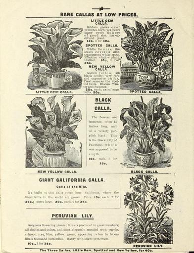 | Keywords: Flowers (16450590635).jpg RARE CALLAS AT LOW PRSCES <br> LITTLE GEM <br> LITTLE GEM <br> CALLA <br> Seldom grows over <br> 10 inches high yet bears <br> many s weet fl o w e rs <br> of good size An ex- <br> cellent plant <br> 12c 3 for 30c <br> SPOTTED CALLA <br> White flowers the <br> leaves covered with <br> transparent white spots <br> Effective window plant <br> Distinct Oc 3 for' <br> 25c <br> NEW YELLOW <br> CALLA <br> Golden yellow jet <br> black centre; very rare <br> and expensive bulbs <br> Treat same as the Spot- <br> ted Calla Blooms Win- <br> ter and Summer <br> 25c each; extra large <br> bulbs 50c <br> SPOTTED CALLA <br> BLACK <br> CALLA <br> The flowers are <br> immense often 15 <br> inches long and <br> of a velvety pur- <br> plish black This <br> is the Black Lily of <br> Palestine w h i c h <br> was supposed to be <br> a myth <br> 10c each 3 for <br> 25c <br> NEW YSLLOW CALLA <br> ABLANC <br> BLACK CALLA <br> GIANT <br> CALIFORNIA <br> CALLA <br> Gall <br> a of the Nile <br> My <br> bulbs of this <br> Call a <br> come from California where <br> the <br> finest bulbs in the <br> world <br> are grown Pr <br> ce 15c each 2 <br> for <br> 25c <br> extra large <br> 20c <br> each 2 for 35c <br> PERUVIAN L3LY <br> i i i 1 1 ยป <br> Gorgeous flowering plants ; flowers produced in great numbers; <br> all shades and colors and most elegantly mottled with purple <br> crimson rose blue yellow green appearing when in bloom <br> like a thousand butterflies Hardy with slight protection <br> I0c 3 for 25c <br> PERUVIAN LILY <br> The Three Callas Little Gem Spotted and New Yellow for 40o 43800645 148987 77812 Text http //www biodiversitylibrary org/page/43800645 1900 Henry G Gilbert Nursery and Seed Trade Catalog Collection ; Miss Mary E Martin Firm ; Miss Mary E Martin Firm Biodiversity Heritage Library Flowers Christmas Easter midwinter and spring Garden Stories Catalogs Flowers Miss Mary E Martin Firm Nurseries Horticulture Seeds U S Department of Agriculture National Agricultural Library bhl page 43800645 dc identifier http //biodiversitylibrary org/page/43800645 bhlGardenStories Yellow Calla Little Gem Calla Spotted Calla Black Calla Peruvian Lily BHLinbloom miss mary e martin firm nurseries horticulture u s department of agriculture national agricultural library bhlgardenstories yellow calla little gem calla spotted calla peruvian lily bhlinbloom Information field Flickr posted date ISOdate 2015-02-05 CC-BY-2 0 BioDivLibrary https //flickr com/photos/61021753 N02/16450590635 2015-08-25 00 55 14 cc-by-2 0 PD-old-70-1923 Miss Mary E Martin Firm seed catalog Photos uploaded from Flickr by Fรฆ using a script |