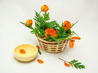 Keywords: flowers basket green orange yellow nature summer bloom saucer leaves wicker