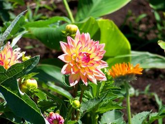 Keywords: flowers dahlias garden blooms blooming blossoms green leaves stems leafy background green background orange pink petals buds shoots flowering plants ornamental decorative layered floral fleurs multiple layers