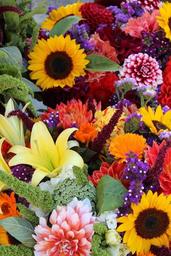 Keywords: flowers farmers market market stall colorful blooms blossoms bouquets retail bunch bright display flower trade sunflowers lily