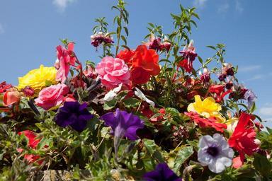 Keywords: flowers flowerpot summer flowers colorful lush decorative red yellow violet decoration nature sky blue