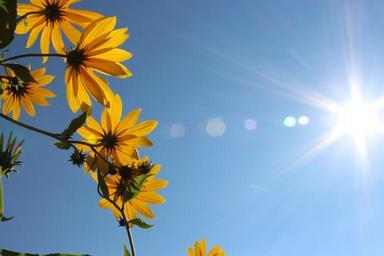 Keywords: flowers sky blue nature blossom bloom spring summer close against the sky sun bloom flora sunny sunbeam plant yellow color back light light