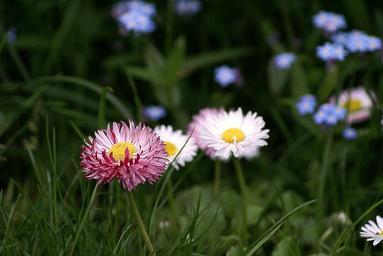 Keywords: flowers small flowers garden flowers daisies nots flowering spring garden flora grass nature white blue the delicacy blades of grass closeup the background composition floral rug