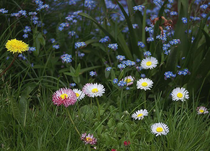 Keywords: flowers small flowers garden flowers daisies nots flowering spring garden flora grass nature white blue the delicacy blades of grass closeup the background composition floral rug