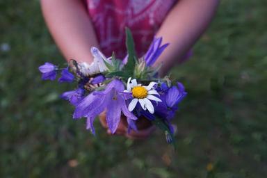 Keywords: flowers strauss purple hands child give gift