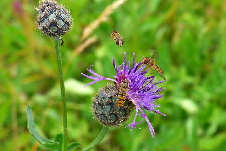 Keywords: flowers violet purple fly hoverfly episyrphus balteatus pincushion flower knapweed flora fauna spring nature