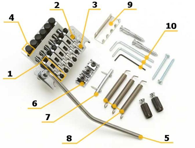| Keywords: Floyd rose pro parts.jpg in an article of figure <br/> Saddle ” A metal box the string is locked into There is one saddle for each string hence six for the standard 6-string guitars and seven for 7-string guitars Each saddle contains a long screw that fixes the string holder block inside it An Allen wrench is required to loosen or tighten these String Holder Block or Saddle Block ” A cube-shaped metal block that presses the string end into the saddle wall thus locking it tight Intonation Screws ” Screws that hold saddles on the base plate; when loose the saddles can be moved forward and backward effectively changing intonation of a string An Allen wrench is required to loosen or tighten these Fine Tuners ” Screws that are used to fine-tune strings instead of the machine heads which cannot be used after the nut has locked the strings at the neck It can be rotated with bare hands Vibrato/Tremolo Arm ” The most visible part of mechanism a handle that can be used to change played notes pitch up and down during play Nut ” A string clamp installed as the zero fret at the neck It has screws and braces called locks to clamp on the strings that run through it An Allen wrench is required to loosen or tighten the nut String Retainer ” A metal bar installed at headstock to retain strings that go to the machine heads Springs ” Springs that pull the bridge downward around the pivot point balancing the string tension They are installed into a cavity that is usually accessible from behind the guitar body and is hidden under plastic cover There are usually 3 springs However to change the resistance of arm to more comfortable one some guitarists may use anything from 1 to 5 springs Spring Claw Hook ” A connector between the guitar body and springs It has special claws to attach the springs to This part is usually mounted to the guitar body using long screws that can be adjusted to change the tension of springs and thus re-balance the whole tremolo system Allen wrenches ” Three sizes are usually supplied with the tremolo The smallest is used for intonation screws; the mid-sized wrench is used for fixing screws on saddle blocks and the largest is for nut screws Floyd Rose Licensed systems usually supplies and uses only two sizes of wrenches as their variation uses the same size for the screws on the saddle blocks and nut However on some models only need the first two as the bridge and nut screws are the same size Floyd Rose Guitar construction Guitar construction schemas Guitar saddles Nuts guitar Diagrams labelled with numbers only |