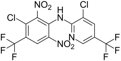 Keywords: Fluazinam 200.svg validSVG Structure of 3-chloro-N- 3-chloro-2 6-dinitro-4- trifluoromethyl phenyl -5- trifluoromethyl pyridin-2-amine Own 2014-05-17 Emeldir <span class signature-talk ></span> PD-chem Fluazinam