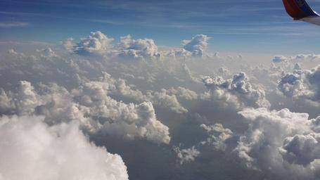 Keywords: fluffy white clouds airplane view sky