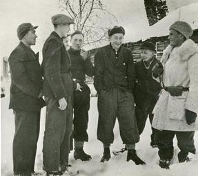 | Keywords: groupshot people Flyktninger fra Nord-Norge til Sverige. Under tyskernes tvangsevakuering i Nord-Norge oktober 1944 lyktes det en del av sivilbefolkningen å ta seg over til Sverige. Under store strabaser og lidelser, hvorunder det også inntraff dødsfall, strevet de seg frem over fjellviddene inntil de tilslutt var i sikkerhet på svensk område. Maunu, en av de svenske grensestasjoner lengst mot nord, har måttet ta imot en stor del av flyktningestrømmen. Bildet viser en svensk beredskapsmann i samtale med norske gutter. Stockholm 24.1.45. RA/Pa-1209/Uc¬¬/68/1/S 5404 Flyktninger fra Nord-Norge til Sverige. Under tyskernes tvangsevakuering i Nord-Norge oktober 1944 lyktes det en del av sivilbefolkningen å ta seg over til Sverige. Under store strabaser og lidelser, hvorunder det også inntraff dødsfall, strevet de seg frem over fjellviddene inntil de tilslutt var i sikkerhet på svensk område. Maunu, en av de svenske grensestasjoner lengst mot nord, har måttet ta imot en stor del av flyktningestrømmen. Bildet viser en svensk beredskapsmann i samtale med norske gutter. Stockholm 24.1.45. RA/Pa-1209/Uc¬¬/68/1/S 5404 |