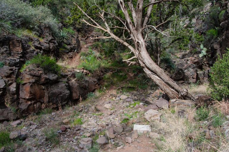 Keywords: arizona coconino national forest coconinonationalforest flume trail flumetrail forest service forestservice fossil creek fossilcreek fossil springs fossilsprings fossil springs wilderness fossilspringswilderness national forest nationalforest red rock ranger district redrockrangerdistrict tonto national forest tontonationalforest backpacking canyon desert forest hiking outdoors spring springtime trail wilderness camp verde campverde united states unitedstates outdoor The wide trail suddenly turns into a narrow single-track, winding down into this drainage and back out to the wide two-track trail after a couple hundred feet. The Flume Trail starts at the old Irving Power Plant location and follows the line of the now-removed flume that carried the water from the dam to the power plants for generating electricity. The trail ends at the old Fossil Creek Dam, a four and a half mile trek one way. The trail ascends steadily about 500 feet from an elevation of 3769 foot at the trailhead over the first mile. For the next three and a half miles, the trail rolls gently several times in approximately 150 foot elevation changes before arriving at the dam. The trail is approximately 500 feet up the side of the canyon, offering fantastic views of the canyon and creek below. There is no creek access between the trailhead and the dam. The trail is very exposed and extremely hot in the warmer months. Hikers should carry at least four quarts of water. The trail is in the Fossil Creek Wilderness. Bikes and mechanized vehicles are prohibited. Camping is prohibited along Flume Trail, from the Fossil Creek Dam for several miles downstream (west) along the canyon. Flume Trail meets Fossil Springs Trail at the old dam. Continue another half mile through a narrow section of the canyon to find easy camping near the creek in the springs area. Camping is permitted during the fall-winter season 100 feet or more from the creek. A half mile from the dam is a marked side trail leading to the first spring source, where many hikers choose to refill their water bottles. Fossil Creek is one of two Wild and Scenic rivers in Arizona. A series of springs gush 20,000 gallons a minute year-round at the bottom of a 1,600 foot deep canyon, creating a lush riparian oasis rich with life. Over the years these calcium laden waters have laid down huge deposits of a type of limestone called travertine, creating deep pools for miles along the creek. The Wilderness and surrounding area are on the Tonto and Coconino National Forests, and are managed by the Coconino National Forest. During the spring-summer season, camping is prohibited anywhere in the Wilderness and surrounding area, and a reserved parking permit is required to park at the Flume trailhead at the Irving parking lot. See Flume Trail and Fossil Creek on the USFS Coconino National Forest website for maps, regulations, permit reservations, and other details. Photo by Deborah Lee Soltesz, March 11, 2016. Source: USFS Coconino National Forest. The wide trail suddenly turns into a narrow single-track, winding down into this drainage and back out to the wide two-track trail after a couple hundred feet. The Flume Trail starts at the old Irving Power Plant location and follows the line of the now-removed flume that carried the water from the dam to the power plants for generating electricity. The trail ends at the old Fossil Creek Dam, a four and a half mile trek one way. The trail ascends steadily about 500 feet from an elevation of 3769 foot at the trailhead over the first mile. For the next three and a half miles, the trail rolls gently several times in approximately 150 foot elevation changes before arriving at the dam. The trail is approximately 500 feet up the side of the canyon, offering fantastic views of the canyon and creek below. There is no creek access between the trailhead and the dam. The trail is very exposed and extremely hot in the warmer months. Hikers should carry at least four quarts of water. The trail is in the Fossil Creek Wilderness. Bikes and mechanized vehicles are prohibited. Camping is prohibited along Flume Trail, from the Fossil Creek Dam for several miles downstream (west) along the canyon. Flume Trail meets Fossil Springs Trail at the old dam. Continue another half mile through a narrow section of the canyon to find easy camping near the creek in the springs area. Camping is permitted during the fall-winter season 100 feet or more from the creek. A half mile from the dam is a marked side trail leading to the first spring source, where many hikers choose to refill their water bottles. Fossil Creek is one of two Wild and Scenic rivers in Arizona. A series of springs gush 20,000 gallons a minute year-round at the bottom of a 1,600 foot deep canyon, creating a lush riparian oasis rich with life. Over the years these calcium laden waters have laid down huge deposits of a type of limestone called travertine, creating deep pools for miles along the creek. The Wilderness and surrounding area are on the Tonto and Coconino National Forests, and are managed by the Coconino National Forest. During the spring-summer season, camping is prohibited anywhere in the Wilderness and surrounding area, and a reserved parking permit is required to park at the Flume trailhead at the Irving parking lot. See Flume Trail and Fossil Creek on the USFS Coconino National Forest website for maps, regulations, permit reservations, and other details. Photo by Deborah Lee Soltesz, March 11, 2016. Source: USFS Coconino National Forest.
