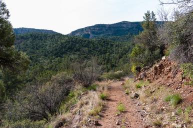 | Keywords: arizona coconino national forest coconinonationalforest flume trail flumetrail forest service forestservice fossil creek fossilcreek fossil springs fossilsprings fossil springs wilderness fossilspringswilderness national forest nationalforest red rock ranger district redrockrangerdistrict tonto national forest tontonationalforest backpacking canyon desert forest hiking outdoors spring springtime trail wilderness camp verde campverde united states unitedstates outdoor hill landscape mountainside foothill The Flume Trail starts at the old Irving Power Plant location and follows the line of the now-removed flume that carried the water from the dam to the power plants for generating electricity. The trail ends at the old Fossil Creek Dam, a four and a half mile trek one way. The trail ascends steadily about 500 feet from an elevation of 3769 foot at the trailhead over the first mile. For the next three and a half miles, the trail rolls gently several times in approximately 150 foot elevation changes before arriving at the dam. The trail is approximately 500 feet up the side of the canyon, offering fantastic views of the canyon and creek below. There is no creek acccess between the trailhead and the dam. The trail is very exposed and extremely hot in the warmer months. Hikers should carry at least four quarts of water. The trail is in the Fossil Creek Wilderness. Bikes and mechanized vehicles are prohibited. Camping is prohibited along Flume Trail, from the Fossil Creek Dam for several miles downstream (west) along the canyon. Flume Trail meets Fossil Springs Trail at the old dam. Continue another half mile through a narrow section of the canyon to find easy camping near the creek in the springs area. Camping is permitted during the fall-winter season 100 feet or more from the creek. A half mile from the dam is a marked side trail leading to the first spring source, where many hikers choose to refill their water bottles. Fossil Creek is one of two Wild and Scenic rivers in Arizona. A series of springs gush 20,000 gallons a minute year-round at the bottom of a 1,600 foot deep canyon, creating a lush riparian oasis rich with life. Over the years these calcium laden waters have laid down huge deposits of a type of limestone called travertine, creating deep pools for miles along the creek. The Wilderness and surrounding area are on the Tonto and Coconino National Forests, and are managed by the Coconino National Forest. During the spring-summer season, camping is prohibited anywhere in the Wilderness and surrounding area, and a reserved parking permit is required to park at the Flume trailhead at the Irving parking lot. See Flume Trail and Fossil Creek on the USFS Coconino National Forest website for maps, regulations, permit reservations, and other details. Photo by Deborah Lee Soltesz, March 11, 2016. Source: USFS Coconino National Forest. The Flume Trail starts at the old Irving Power Plant location and follows the line of the now-removed flume that carried the water from the dam to the power plants for generating electricity. The trail ends at the old Fossil Creek Dam, a four and a half mile trek one way. The trail ascends steadily about 500 feet from an elevation of 3769 foot at the trailhead over the first mile. For the next three and a half miles, the trail rolls gently several times in approximately 150 foot elevation changes before arriving at the dam. The trail is approximately 500 feet up the side of the canyon, offering fantastic views of the canyon and creek below. There is no creek acccess between the trailhead and the dam. The trail is very exposed and extremely hot in the warmer months. Hikers should carry at least four quarts of water. The trail is in the Fossil Creek Wilderness. Bikes and mechanized vehicles are prohibited. Camping is prohibited along Flume Trail, from the Fossil Creek Dam for several miles downstream (west) along the canyon. Flume Trail meets Fossil Springs Trail at the old dam. Continue another half mile through a narrow section of the canyon to find easy camping near the creek in the springs area. Camping is permitted during the fall-winter season 100 feet or more from the creek. A half mile from the dam is a marked side trail leading to the first spring source, where many hikers choose to refill their water bottles. Fossil Creek is one of two Wild and Scenic rivers in Arizona. A series of springs gush 20,000 gallons a minute year-round at the bottom of a 1,600 foot deep canyon, creating a lush riparian oasis rich with life. Over the years these calcium laden waters have laid down huge deposits of a type of limestone called travertine, creating deep pools for miles along the creek. The Wilderness and surrounding area are on the Tonto and Coconino National Forests, and are managed by the Coconino National Forest. During the spring-summer season, camping is prohibited anywhere in the Wilderness and surrounding area, and a reserved parking permit is required to park at the Flume trailhead at the Irving parking lot. See Flume Trail and Fossil Creek on the USFS Coconino National Forest website for maps, regulations, permit reservations, and other details. Photo by Deborah Lee Soltesz, March 11, 2016. Source: USFS Coconino National Forest. |