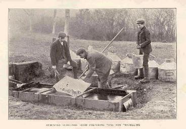| Keywords: FMIB 32612 Removing Yearlings from Preparing Tank for Traveling.jpeg check categories 14 August 2015 3 Removing Yearlings from Preparing Tank for Traveling Subject Fish-culture Tag Sport Fishing 1899 Cite book The Trout Rutland Henry John Brinsley Manners Duke of New York Longmans Green and Co 1899 Fur Feather and Fin Series Facing Page 230 Creator James Edward Grace PD-UWASH-FMIB Institution University of Washington FMIB-source accession number 32612 Images from the Freshwater and Marine Image Bank to check Fish farming Recreational fishing James Edward Grace |