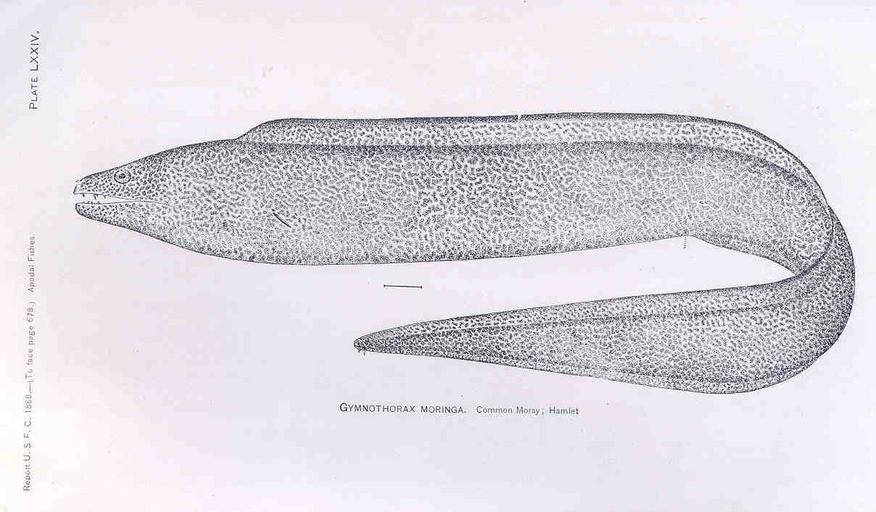 | Keywords: FMIB 33389 Gymnothorax Moringa.jpeg Gymnothorax Moringa Common Moray; Hamlet Subject Morays Eels Tag Fish 1888/1889 Cite book Preliminary review of the apodal fishes or eels inhabiting the waters of America and Europe Jordan David Starr Washington DC Government Printing Office 1892 Report of the Commissioner United States Commission of Fish and Fisheries 1888/1889 Plate LXXIV Creator David Starr Jordan PD-UWASH-FMIB Institution University of Washington FMIB-source accession number 33389 Gymnothorax moringa Drawings of fish by David Starr Jordan |