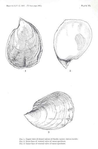 Keywords: FMIB 33791 Pacific Oyster, Ostrea turida.jpeg check categories 15 August 2015 3 Pacific Oyster Ostrea turida Upper View of Closed Valves 1 ;; Inner Face of Ventral Valve 2 ;; Outer Face of Ventral Valve 3 Subject Olympia oyster Crassostrea gigas Tag Shellfish 1896/1897 Cite book Notes on Clam-Culture Washington DC Government Printing Office 1898 Report of the Commissioner United States Commission of Fish and Fisheries 1896/1897 Plate VI author PD-UWASH-FMIB Institution University of Washington FMIB-source accession number 33791 Images from the Freshwater and Marine Image Bank to check Ostrea lurida Crassostrea gigas Oysters |
