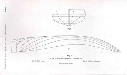 | Keywords: FMIB 34012 Plans of Schooner Mitchie.jpeg Plans of Schooner Mitchie Body Plan 1 ;; Half-Breadth Plan 2 Subject Schooners--Design and construction Mitchie Schooner Naval architecture Tag Vessels 1887 Cite book Report Upon the Operations of the U S Fish Commission Schooner Grampus from March 15 1887 to June 30 1888 Report of the Commissioner United States Commission of Fish and Fisheries 1887 Collins J W Washington DC Government Printing Office 1891 Plate VI Josiah Manuel PD-UWASH-FMIB Institution University of Washington FMIB-source accession number 34012 Images from the Freshwater and Marine Image Bank to check Josiah Manuel Mitchie ship Line drawings of ships Naval architecture |