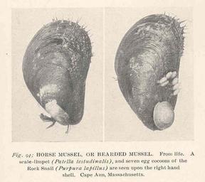 | Keywords: FMIB 38582 Horse Mussel or Bearded Mussel From Life A Scale-limpet (Patella testudinalis) and seven egg cocoons of the Rock Snail (Purpura.jpeg Horse Mussel or Bearded Mussel From Life A Scale-limpet Patella testudinalis and seven egg cocoons of the Rock Snail Purpura lapillus are seen upon the right hand shell Subject Mussels Horse mussels Tag Shellfish 1905 Cite book Sea-Shore Life the Invertebrates of the New York Coast and the Adjacent Coast Region Mayer Alfred Goldsborough New York City NY A S Barnes Company 1906 Fig 94 Creator Alfred Goldsborough Mayer PD-UWASH-FMIB Institution University of Washington FMIB-source accession number 38582 Images from the Freshwater and Marine Image Bank to check Alfred G Mayer Testudinalia testudinalis Nucella lapillus |