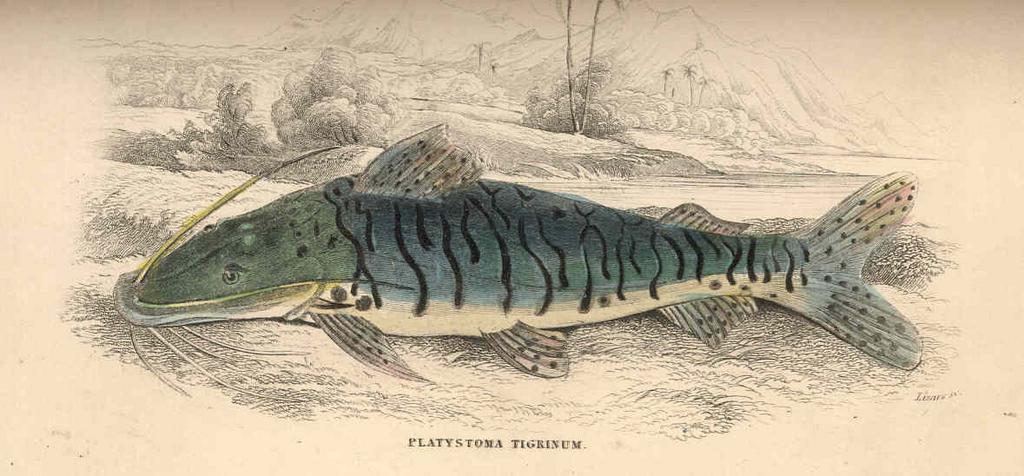 | Keywords: FMIB 38621 Platystoma tigrinum.jpeg Platystoma tigrinum Subject Platystomatidae Tag Fish 1852 Cite book Fishes of British Guiana Part I Schomburgk R H Edinburgh Scotland W H Lizars 1852 Naturalist's Library vol 39 Facing page 184 Creator Robert Hermann Schomburgk PD-UWASH-FMIB Institution University of Washington FMIB-source accession number 38621 Images from the Freshwater and Marine Image Bank to check Robert Hermann Schomburgk Pseudoplatystoma tigrinum | ||||