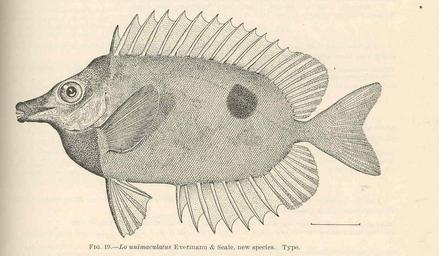 | Keywords: FMIB 39239 Lo unimaculatus Evermann & Seale, new species Type.jpeg Lo unimaculatus Evermann Seale new species Type Subject Siganidae Lo Tag Fish 1907 Cite book Fishes of the Philippine Islands Evermann Barton Warren Washington DC Government Printing Office 1907 Bulletin of the Bureau of Fisheries vol 26 1906 Fig 19 Creator Barton Warren Evermann PD-UWASH-FMIB Institution University of Washington FMIB-source accession number 39239 Images from the Freshwater and Marine Image Bank to check Barton Warren Evermann Siganus unimaculatus |
