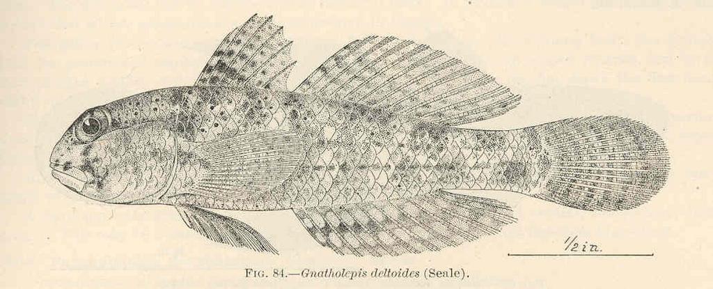 | Keywords: FMIB 39679 Gnatholepis deltoides (Seale).jpeg Gnatholepis deltoides Seale Subject Gnatholepis Gobiidae Tag Fish 1906 of the Species Found in the Archipelago with a Provisional Check-List of the Fishes of Oceania Jordan David Starr; Seale Alvin Washington DC Government Printing Office 1906 Bulletin of the Bureau of Fisheries v 25 1905 Fig 84 Creator David Starr Jordan Creator Alvin Seale PD-UWASH-FMIB Institution University of Washington FMIB-source accession number 39679 Images from the Freshwater and Marine Image Bank to check David Starr Jordan Alvin Seale Gnatholepis anjerensis |