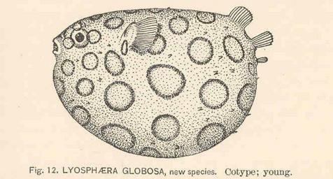 | Keywords: FMIB 39782 Lyosphaera globosa, new species Cotype; young.jpeg check categories 15 September 2015 3 Lyosphaera globosa new species Cotype; young Subject Diodontidae Lyosphaera Tag Fish 1898 s of New or Little-Known Genera and Species of Fishes from the United States Evermann Barton W ; Kendall William C Washington DC Government Printing Office 1898 Bulletin of the United States Fish Commission vol 17 1897 Plate 9-12 Creator Barton Warren Evermann Creator William Converse Kendall PD-UWASH-FMIB Institution University of Washington FMIB-source accession number 39782 Images from the Freshwater and Marine Image Bank to check Barton Warren Evermann Drawings of fish by William Converse Kendall Diodontidae |