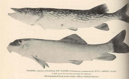 | Keywords: FMIB 39800 Pickerel (Lucius reticulatus) and Sucker (Castostomus commersonii) with Lamprey Scars In both cases the wounds penetrate the.jpeg check categories 19 September 2015 4 Pickerel Lucius reticulatus and Sucker Castostomus commersonii with Lamprey Scars In both cases the wounds penetrate the abdomen Subject Pickerels Catostomidae Lampreys Tag Fish 1898 en Cite book Lampreys of Central New York Bulletin of the United States Fish Commission vol 17 1897 Surface H A Washington DC Government Printing Office 1898 Plate 10-3 H A Surface PD-UWASH-FMIB Institution University of Washington FMIB-source accession number 39800 Images from the Freshwater and Marine Image Bank to check H A Surface Esox Catostomus commersonii Cephalaspidomorphi |