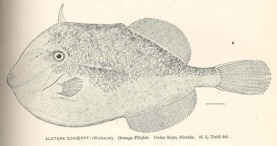 Keywords: FMIB 40124 Alutera schoepffi (Walbaum) Orange Filefish Cedar Keys, Florida.jpeg Alutera schoepffi Walbaum Orange Filefish Cedar Keys Florida Subject Alutera schoepfi Tag Fish 1894 Cite book Fishes of Texas and the Rio Grande Basin Considered Chiefly with Reference to Their Geographic Distribution Evermann Barton W ; Kendall William C Washington DC Government Printing Office 1894 Bulletin of the United States Fish Commission vol 12 1892 Plate XLIX-2 Creator Barton Warren Evermann Creator William Converse Kendall PD-UWASH-FMIB Institution University of Washington FMIB-source accession number 40124 Images from the Freshwater and Marine Image Bank to check Barton Warren Evermann Drawings of fish by William Converse Kendall Aluterus schoepfii |