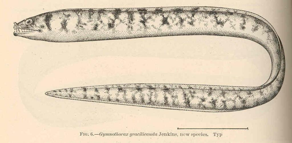 | Keywords: FMIB 41021 Gymnothorzx gracilicauda Jenkins, new species.jpeg Gymnothorzx gracilicauda Jenkins new species Subject Morays Gymnothorax Tag Fish 1904 s of New Species Jenkins Oliver P Washington DC Government Printing Office 1904 Bulletin of the United States Fish Commission vol 22 1902 Fig 6 Creator Oliver Peebles Jenkins PD-UWASH-FMIB Institution University of Washington FMIB-source accession number 41021 Images from the Freshwater and Marine Image Bank to check Oliver Peebles Jenkins Gymnothorax gracilicauda |