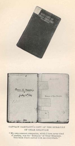 | Keywords: FMIB 41184 Captain Bartlett's Copy of the Rubaiyat of Omar Khayyam - 'My own constant companion, which I have never tired of reading, was.jpeg check categories 8 September 2015 3 Captain Bartlett's Copy of the Rubaiyat of Omar Khayyam 'My own constant companion which I have never tired of reading was the 'Rubaiyat' of Omar Khayyam This book I have carried with me everywhere' Subject Books Omar Khayyam Tag Polar 1916 Cite book Last Voyage of the Karluk Flagship of Vilhjalmar Stefansson's Canadian Arctic Expedition of 1913-16 Bartlett Robert A Boston MA Small Maynard and Company 1916 Facing page 102 Creator Robert Bartlett PD-UWASH-FMIB Institution University of Washington FMIB-source accession number 41184 Images from the Freshwater and Marine Image Bank to check Robert Bartlett explorer Omar Khayyam Polar |