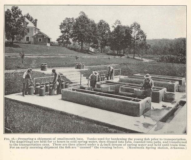 | Keywords: FMIB 42212 Preparing a shipment of smallmouth bass Tanks used for hardening the young fish prior to transportation The fingerlings are held.jpeg check categories 17 August 2015 3 Preparing a shipment of smallmouth bass Tanks used for hardening the young fish prior to transportation The fingerlings are held for 12 hours in cold spring water then dipped into tubs counted into pails and transferred to the transportation cans Th Subject Fish hatcheries Mammoth Spring Station Arkansas Mammoth Hot Springs Arkansas Smallmouth bass--Transportation Geographic Subject United States--Arkansas--Mammoth Hot Springs Tag Hatcheries 1910 Cite book Fish-Cultural Practices in the United States Bureau of Fisheries Titcomb John W Washington DC Government Printing Office 1910 Bulletin of the Bureau of Fisheries vol 28 1908 Part 2 Plate LXXXV-18 Creator John Wheelock Titcomb PD-UWASH-FMIB Institution University of Washington FMIB-source accession number 42212 Images from the Freshwater and Marine Image Bank to check John Wheelock Titcomb Fish hatcheries Arkansas |