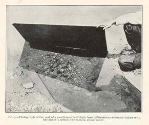 | Keywords: FMIB 42277 Photograph of the nest of a small-mouthed black bass (Micropterus dolomieu) taken witht he add of a screen, the camera above.jpeg Photograph of the nest of a small-mouthed black bass Micropterus dolomieu taken witht he add of a screen the camera above water Subject Smallmouth bass--Nests Underwater photography--Equipment and supplies Tag Fish 1910 Cite book Methods of Studying the Habits of Fishes with an Account of the Breeding Habits of the Horned Dace Reighard Jacob Washington DC Government Printing Office 1910 Bulletin of the Bureau of Fisheries vol 28 1908 Part 2 Plate CXVI-5 Creator Jacob Ellsworth Reighard PD-UWASH-FMIB Institution University of Washington FMIB-source accession number 42277 Images from the Freshwater and Marine Image Bank to check Jacob Ellsworth Reighard Micropterus dolomieu |