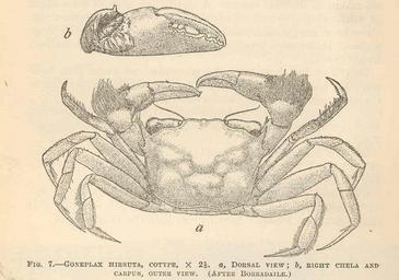 | Keywords: FMIB 43723 Goneplax hirsuta, Cotype a, dorsal view; b, right chela and carpus, outer view (After Borradaile).jpeg check categories 22 August 2015 4 Goneplax hirsuta Cotype a dorsal view; b right chela and carpus outer view After Borradaile Subject Crabs Goneplax Tag Shellfish 1918 Cite book Grapsoid Crabs of America Rathbun Mary J Washington DC Government Printing Office 1918 Bulletin United States National Museum ; no 97 Fig 7 Creator Mary J Rathbun PD-UWASH-FMIB Institution University of Washington FMIB-source accession number 43723 Images from the Freshwater and Marine Image Bank to check Mary J Rathbun Brachyura Goneplax |