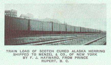 | Keywords: FMIB 45033 Train Load of Scotch Cured Alaska Herring Shipped to Menzel & Co, of New York by F J Hayward, from Prince Rupert, B C.jpeg Train Load of Scotch Cured Alaska Herring Shipped to Menzel Co of New York by F J Hayward from Prince Rupert B C Subject Herring fisheries Fishery products--Transportation Railroads Tag Commercial Fisheries 1918 Cite book Train Load of Scotch Cured Alaska Herring Shipped to Menzel Co of New York by F J Hayward from Prince Rupert B C Seattle WA 1918 Pacific Fisherman Year Book 1918 89a author PD-UWASH-FMIB Institution University of Washington FMIB-source accession number 45033 Images from the Freshwater and Marine Image Bank to check Freight trains Clupea |
