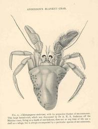 | Keywords: FMIB 45417 Anderson's Blanket-Crab.jpeg check categories 23 August 2015 4 Anderson's Blanket-Crab Chlaenopagurus andersoni with its protective planket of sea-anemones This large hermit-crab which was discovered by Dr A R S Anderson off the Malabar coast living at a depth of 102 fathoms does not at any time of life use a shell as a refuge but is always accompanied by a particular species of sea-anemones Subject Hermit crabs Chlaenopagurus Tag Shellfish 1902 Cite book Naturalist in Indian Seas or Four Years with the Royal Indian Marine Survey Ship 'Investigator' Alcock Alfred W New York City NY E P Dutton Co 1902 Fig 2 Creator Alfred William Alcock PD-UWASH-FMIB Institution University of Washington FMIB-source accession number 45417 Images from the Freshwater and Marine Image Bank to check Alfred William Alcock Paguroidea Paguropsis Brachyura |