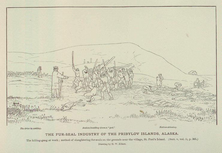 | Keywords: FMIB 46003 Fur-Seal Industry of the Pribylov Islands, Alaska.jpeg Fur-Seal Industry of the Pribylov Islands Alaska The killing-gang at work; method of slaughtering fur-seals on the grounds near the village St Paul's Island Subject Sealers Saint Paul Island Alaska Northern fur seal Sealing Geographic Subject United States--Alaska--Saint Paul Island Tag Aquatic Mammals 1887 Cite book Fisheries and Fishery Industries of the United States Goode George Brown Washington DC Government Printing Office 1887 Plate 225 Creator Henry Wood Elliott PD-UWASH-FMIB Institution University of Washington FMIB-source accession number 46003 Images from the Freshwater and Marine Image Bank to check Seal hunting Saint Paul Island Alaska Callorhinus ursinus Fur-Seal Industry of the Pribylov Islands Alaska |