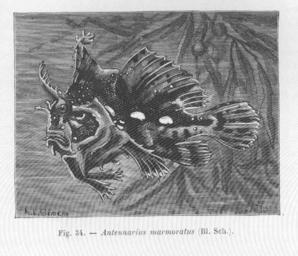 | Keywords: FMIB 46946 Antennarius marmoratus (Bl Sch).jpeg Antennarius marmoratus Bl Sch Subject Antennarius Tag Fish 1885 Cite book Vie au Fond des Mers les Explorations Sous-Marines et les Voyages du Travailleur et du Talisman Filhol H Paris France G Masson Editeur 1885 Figure 34 A L Clement PD-UWASH-FMIB Institution University of Washington FMIB-source accession number 46946 Images from the Freshwater and Marine Image Bank to check A L Clement Histrio histrio | ||||