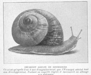 | Keywords: FMIB 47199 Escargot Adulte de Bourgogne.jpeg Escargot Adulte de Bourgogne Ce n'est qu'apres 3 ou 4 ans e'engraissement que l'Escargot atteint tout son developpement Portant sa coquille legere il raccoureit ou allonge ses antennes Subject Snails Edible snails Tag Mollusks 1911 Cite book l'Escargot Elevage et Parcage Lucratifs preparation culinaire et vente Boisseau G ; Lanorville G Paris France Librairie Hachette 1911 Plate 1a Creator G Boisseau Creator Georges Lanorville PD-UWASH-FMIB Institution University of Washington FMIB-source accession number 47199 Images from the Freshwater and Marine Image Bank to check G Boisseau Georges Lanorville Unidentified Gastropoda |