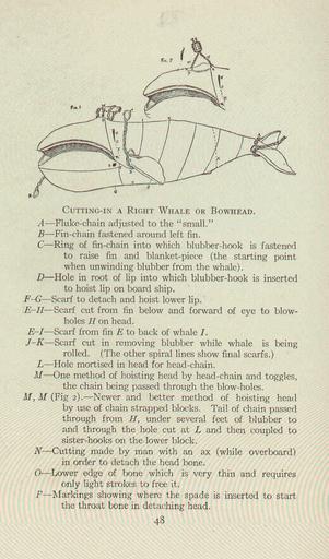 | Keywords: FMIB 47505 Cutting-In a Right Whale or Bowhead.jpeg check categories 21 August 2015 2 Cutting-In a Right Whale or Bowhead A-Fluke-chain adjusted to the small B-Fin-Chain fastened around left fin C-Ring of fin-chain into which blubber-hook is fastened to raise fin and blanket-piece the starting point when unwinding blubber from the whale D-Hole in root of lip into which blubber-hook is inserted to hoist lip on board ship F-G- Scarf to detach and hoist lower lip E-H- Scarf cut from fin below and forward of eye to blow-holes H on head E-I- Scarf from fin E to back of whale I J-K- Scarf cut in removing blubber while whale is being rolled The other spiral lines show final scarfs L-Hole mortised in head for head-chain M-One method of hoisting head by head-chain and toggles the chain being pasdsed through the blow-holes M M Fig 2 -Newer and better method of hoisting head by use of chain strapped blocks Tail of chain passed through from H under several feet of blubber to and through the hole cut at L and then coupled to sister-hooks on the lower block N-Cutting made by man with an ax while overboard in order to detach the head bone O-Lower edge of bone which is very thin and requires only light strokes to free it P-Markings showing where the spade is inserted to start the throat bone in detaching head Q-Where the hole is made in throat in order to haul it on board R-Throat-chain and toggle by wihich throat is sometimes taken on board S-Dotted line to show where backbone is cut to lessen strain on windlass when taking off lbubber T-Wide section of blanket-piece which is trimmed down by boarding-knife when taking blubber on board Subject Whaling--Equipment and supplies Tag Aquatic Mammals 1916 00 Cite book Real Story of the Whaler Whaling Past and Present Verrill A Hyatt Alpheus Hyatt New York City NY D Appleton and Company 1916 48 Creator Alpheus Hyatt Verrill PD-UWASH-FMIB Institution University of Washington FMIB-source accession number 47505 Images from the Freshwater and Marine Image Bank to check Alpheus Hyatt Verrill Marine mammals |