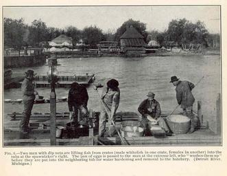 | Keywords: FMIB 47513 Two men with dip nets are lifting fish from crates (male whitefish in one crate, females in another) into the tubs at the.jpeg check categories 19 August 2015 3 Two men with dip nets are lifting fish from crates male whitefish in one crate females in another into the tubs at the spawntaker's right The pan of eggs is passed to the man at the extreme left who 'washes them up' before they are put into the neighboring tubs for water hardening and removal to the hatchery Detroit River Michigan Subject Whitefishes--Culture Detroit River Michigan and Ontario Fishes--Spawning Geographic Subject United States--Michigan--Detroit River Canada--Ontario--Detroit River Tag Hatcheries 1910 00 Cite book Fish-Cultural Practices in the United States Bureau of Fisheries Titcomb John W Washington DC Government Printing Office 1910 Bulletin of the Bureau of Fisheries vol 28 1908 Part 2 Plate LXXIX-6 Creator John Wheelock Titcomb PD-UWASH-FMIB Institution University of Washington FMIB-source accession number 47513 Images from the Freshwater and Marine Image Bank to check John Wheelock Titcomb Fish hatcheries Detroit River |