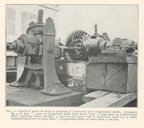 | Keywords: FMIB 47533 Detail of gears on float at junciton of transverse and longitudinal shafts 1 gear on horizontal shaft from house boat; 2 large.jpeg check categories 19 September 2015 2 Detail of gears on float at junciton of transverse and longitudinal shafts 1 gear on horizontal shaft from house boat; 2 large gear on longitudinal shaft reducing speed one-half; 3 gear on the einner end of transverse shaft 4 ; 4 shaft transmitting power to outer float; 5 longitudinal shaft on inner float; 6 oil box Subject Fishes--Transportation Barges Fish culture Tag Aquaculture 1910 00 Cite book New Principle of Aquiculture and Transportation of Live Fishes Bulletin of the Bureau of Fisheries vol 28 1908 Part 2 Mead A D Washington DC Government Printing Office 1910 Plate XCIX-20 A D Mead PD-UWASH-FMIB Institution University of Washington FMIB-source accession number 47533 Images from the Freshwater and Marine Image Bank to check A D Mead Barges |