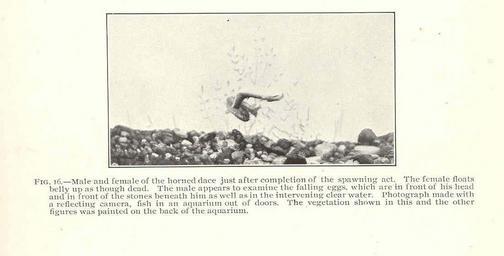 | Keywords: FMIB 47538 Male and female of the horned dace just after completion of the spawning act The female floats belly up as though dead The male.jpeg Male and female of the horned dace just after completion of the spawning act The female floats belly up as though dead The male appears to examine the family of eggs which are in front of his head and in front of the stones beneath him as well as in the intervening clear water Photograph made with a reflecting camera fish in an aquarium out of doors The vegetation shown in this and the other figures were painted on the back of the aquarium Subject Semotilus atromaculatus--Spawning Underwater photography Tag Fish 1910 00 Cite book Methods of Studying the Habits of Fishes with an Account of the Breeding Habits of the Horned Dace Reighard Jacob Washington DC Government Printing Office 1910 Bulletin of the Bureau of Fisheries vol 28 1908 Part 2 Plate CXX-16 Creator Jacob Ellsworth Reighard PD-UWASH-FMIB Institution University of Washington FMIB-source accession number 47538 Images from the Freshwater and Marine Image Bank to check Jacob Ellsworth Reighard Underwater photography Semotilus atromaculatus |