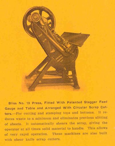 Keywords: FMIB 47600 Bliss No19 Press, Fitted with Patented Stagger Feed Gauge and Table and Arranged with Circular Scrap Cutters--For cutting and.jpeg check categories 19 August 2015 1 Bliss No 19 Press Fitted with Patented Stagger Feed Gauge and Table and Arranged with Circular Scrap Cutters --For cutting and stamping tops and bottoms It reduces waste to a minimum and eliminates previous slitting of sheets It automatically shears the scrap giving the operator at all times solid material to handle This allows of very rapid operation These machines are also built with shear knife scrap cutters Subject Fishery processing industries--Equipment and supplies Canneries--Equipment and supplies Tag Commercial Fisheries 1912 00 Cite book Bliss No 19 Press Fitted with Patented Stagger Feed Gauge and Table and Arranged with Circular Scrap Cutters --For cutting and stamping tops and bottoms It reduces waste to a minimum and eliminates previous slitting of sheets It automatically shears the scrap giving the operator at all times solid material to handle This allows of very rapid operation These machines are also built with shear knife scrap cutters Seattle WA 1912 Pacific Fisherman Annual Statistical Review 1912 Facing page 50 author PD-UWASH-FMIB Institution University of Washington FMIB-source accession number 47600 Images from the Freshwater and Marine Image Bank to check Fisheries Bliss canning machinery |